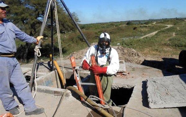 VILLA OCAMPO – COTELVO SERVICIOS – COTELVO Servicios continúa realizando trabajos de limpieza del pozo de bombeo del sistema cloacal de los barrios FONAVI; FOPROVI y aledaños, recientemente transferido por el municipio a la cooperativa.Debido a que hace muchos años que está en desuso, la gente utilizó al mismo como contenedor de todo tipo de residuos; encontrándose en su interior restos de electrodomésticos, cubiertas de vehículos, cuadros de bicicletas, y objetos similares. Esto hizo que COTELVO tuviera que contratar equipamiento especializado para poder acceder a su interior y agilizar los trabajos de limpieza; para ello se recurrió a máscaras con oxígeno, trajes herméticos con patas de rana para poder moverse en líquidos contaminados, malacates y sogas especiales.
