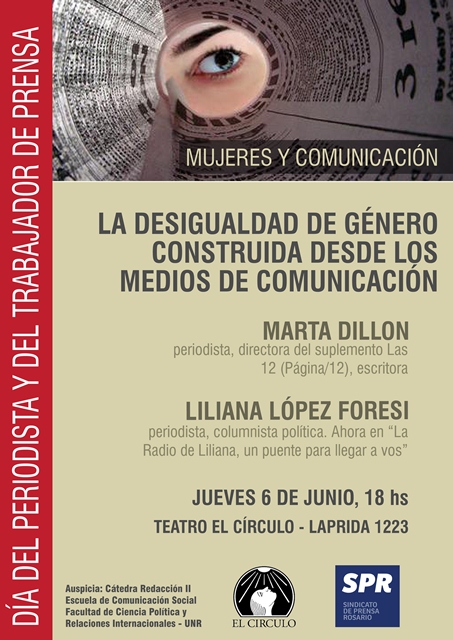 CHARLA-DEBATE EN ROSARIO – El Sindicato de Prensa Rosario invita a la charla-debate «Mujeres y comunicación: la desigualdad de género construida desde los medios», que se desarrollará el jueves 6 de junio, a las 18, en el Teatro El Círculo, Laprida 1223, con la presencia de las periodistas Marta Dillon y Liliana López Foresi. La entrada al encuentro será libre y gratuita.En esta charla-debate se abordará la forma en que desde la televisión, la radio y la gráfica se muestra y potencia la estigmatización hacia las mujeres, los prejuicios y, en definitiva, la inequidad de género, en una forma de construcción del imaginario social que resulta confuso y distorsionado si se pretende una sociedad con igualdad de oportunidades para hombres y mujeres. La actividad se realizará con motivo del “Día del Periodista y del Trabajador de Prensa”.