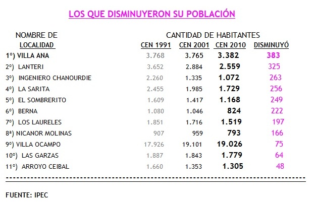 Como contrapartida, la jurisdicción que perdió más gente fue Villa Ana, que en 2010 contabilizó 383 habitantes menos de los que tenía 10 años antes.