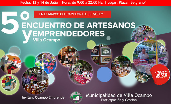VILLA OCAMPO – Invitan a la comunidad a concurrir al 5º Encuentro de Artesanos y Emprendedores, que se llevará a cabo este sábado 13 y domingo 14 de julio, desde las 9:00 hasta las 22:00 Hs., en la Plaza “Belgrano”.La Municipalidad de Villa Ocampo, conjuntamente con los organizadores del evento “Ocampo Emprende” invitan a la comunidad a concurrir al 5º Encuentro de Artesanos y Emprendedores, que se llevará a cabo este sábado 13 y domingo 14 de julio, desde las 9:00 hasta las 22:00 Hs., en la Plaza “Belgrano”.