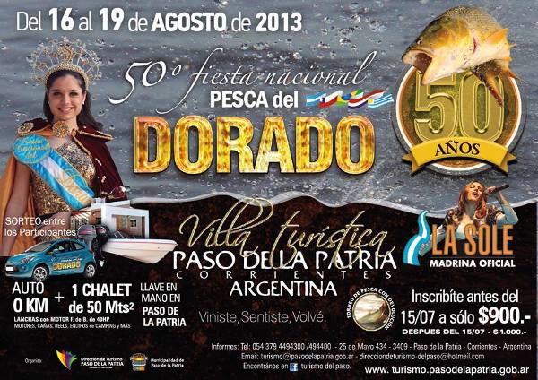 PASO DE LA PATRIA – CORRIENTES – Se lanza en Corrientes este miércoles 17 de julio la presentación de lo que será la Edición N° 50 de la Fiesta Nacional de la Pesca del Dorado en el Salón Verde de la Casa de Gobierno de la Provincia de Corrientes. La Fiesta del «Tigre del Paraná» se realizará del 16 al 19 de Agosto en la Villa Turística de Paso de la Patria.En la oportunidad se prevé contar con la presencia del Intendente de Paso de la Patria, Oscar “Chino” García; el Viceintendente, Armando Bordón; la Directora de Turismo, Stella Maris Villalba Pelucci; representantes de la FECOPE (Federación Correntina de Pesca); COVESA (Comisión Vecinal de saneamiento); el Presidente de la cámara de comercio y Turismo de Paso de la Patria, Vladimir Velazco, y la Subsecretaría de Turismo de la Provincia, Arquitecta Inés Presman.
