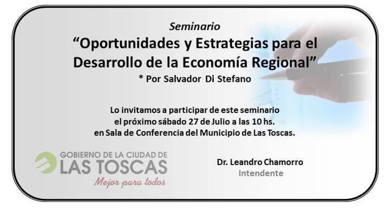 LAS TOSCAS – El próximo sabado 27 de julio, en la sala de conferencia de la municipalidad de Las Toscas, se realizará un seminario «Oportunidades y Estrategias para el Desarrollo de la Economía Regional», cuyo disertantes es Salvador Distefano.En la sala de conferencias de la municipalidad de Las Toscas,  se llevará a cabo un seminario sobre «Oportunidades y Estrategias para el Desarrollo de la Economía Regional», ofrecido por Salvador Di Stefano, un asesor en negocios, económico y financiero.