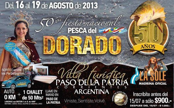 PASO DE LA PATRIA – CORRIENTES – Este miércoles 24 de julio a las 11:00 hs se realizará la presentación de la Edición «Bodas de Oro» de la Fiesta Nacional Pesca del Dorado, la cuál tendrá lugar del 16 al 19 de agosto en la emblemática Villa Turística de Paso de la Patria.El lugar elegido para el encuentro de promoción será la sala de prensa “Escobar Pezzano” de la Casa de Gobierno de Chaco, en la ciudad de Resistencia. Se espera la presencia de importantes autoridades y medios de prensa provinciales.