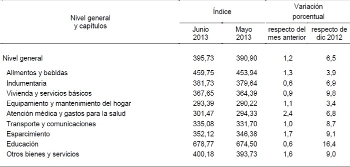 Los bienes y servicios en la provincia registraron en junio una variación con respecto al mes de mayo de 1,3 por ciento en alimentos y bebidas; 0,6 por ciento en indumentaria; 0,9 por ciento en vivienda y servicios básicos; 1,1 por ciento en equipamiento y mantenimiento del hogar; 2,4 por ciento en atención médica y gastos para la salud; 1 por ciento en transporte y comunicaciones; 1,7 por ciento en esparcimiento; 0,6 por ciento en educación; y otros bienes y servicios, un 1,6 por ciento.