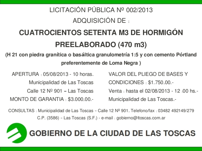 LAS TOSCAS – El Gobierno de la Ciudad de Las Toscas llama a Licitación Pública para la compra de 470 m3 de hormigón preelaborado.Los pliegos de bases y condiciones para presentarse en la licitación podrán ser adquiridos por los interesados en la Municipalidad de Las Toscas, hasta el viernes 02 de agosto a las 12 hs.