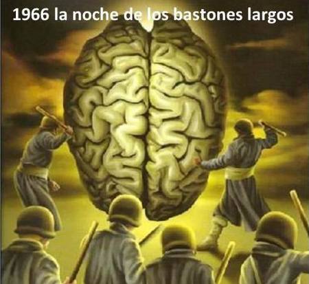Se la conoce como «LA NOCHE DE LOS BASTONES LARGOS», por el instrumento que se utilizó para golpear a los universitarios, con órdenes expresas de apuntar -y no por casualidad- a la cabeza. Fueron detenidas 400 personas y destruidos laboratorios y bibliotecas universitarias.