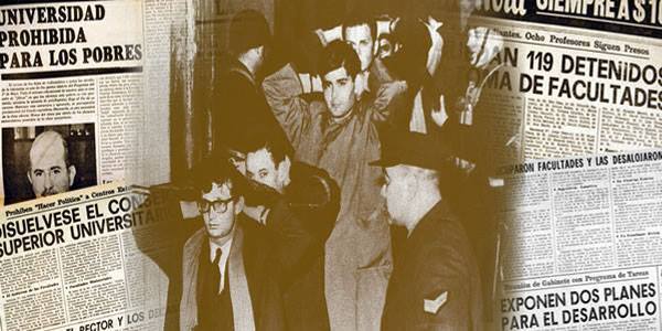 – La noche del 29 de julio de 1966, la Policía Federal Argentina, a las órdenes de la recién instaurada dictadura del General Onganía, irrumpió en cinco facultades de la Universidad de Buenos Aires, apaleando a estudiantes, graduados y profesores encerrados en defensa de la autonomía universitaria.»¡HAY QUE LIMPIAR ESTA CUEVA DE MARXISTAS!» Bajo esa consigna, la noche del 29 de julio de 1966 la Policía Federal Argentina -a las órdenes de la recién instaurada dictadura del General Onganía- irrumpió en cinco facultades de la Universidad de Buenos Aires, apaleó a estudiantes, graduados y profesores encerrados en defensa de la autonomía universitaria, y escribió la página más oscura de la historia académica argentina.