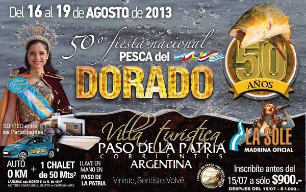 PASO DE LA PATRIA – CORRIENTES – La Edición N° 50º de la Fiesta Nacional de Pesca del Dorado ingresa en su recta final y la expectativa aumenta en toda Argentina. Del 16 al 20 de agosto, Paso de la Patria será anfitrión de la fiesta de pesca deportiva más antigua del país.Ya se palpita en todo el país la fiesta del «Tigre del Paraná», la cuál es la de mayor antiguedad de Argentina y todo un ícono turístico en la región Litoral. Por tal motivo la edición “bodas de oro” de la Fiesta del Dorado llevó adelante una gira de difusión por distintas ciudades de las provincias de Corrientes y Misiones, siendo recibido por autoridades, medios de prensa locales y pescadores.