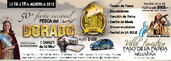 PASO DE LA PATRIA – CORRIENTES – Desde este viernes, se llevan a cabo en esta localidad correntina la Edición N°50 de la Fiesta Nacional de la Pesca del Dorado, donde ofrecerá innumerables atracciones artísticas, musicales, deportivas y sociales, entre las que se destacan las actuaciones de Soledad, Abel Pintos, Los Pericos y Los Alonsitos.Las actividades comenzarás este viernes con arribo de delegaciones, pescadores, expositores. En horas de la noche, estarà actuando Abel Pintos. El sábado 17, hará lo propio el grupo Los Pericos poniendo calor a la noche en la villa turística, mientras que para el domingo 18 está prevista la actuación especial de La Sole. Vale destacar que todos estos espectáculos serán con entrada libre y gratuita, por lo que se recomienda acercarse con debida antelación para ir ganando lugares de privilegio.