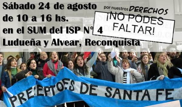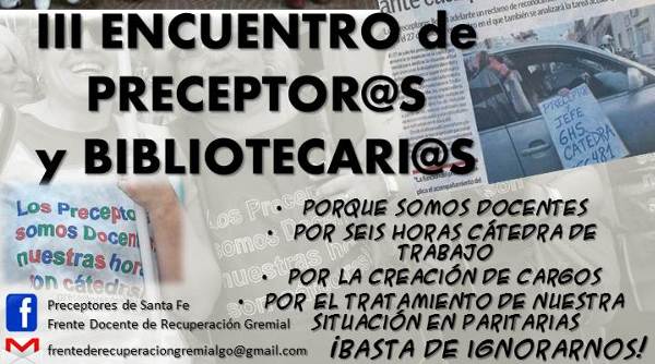 RECONQUISTA – Desde el grupo de Preceptores de Santa Fe y el Frente Docente de Recuperación Gremial del Departamento General Obligado invitamos a preceptores/as y bibliotecarios/as de la región a participar del III Encuentro de Preceptores y Bibliotecarios de la provincia de Santa Fe.El mismo tendrá lugar este sábado 24 de agosto, de 10 a 16 horas, en el SUM del ISP N° 4 “Ángel Cárcano” (Alvear y Ludueña, Reconquista).