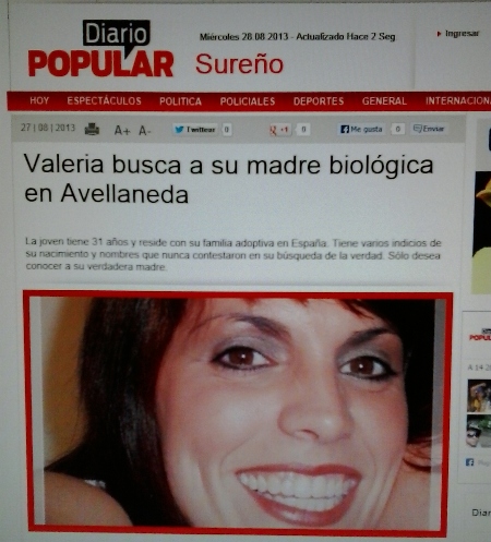 «Mi nombre es Valeria. Nací en Avellaneda el 23 de marzo de 1982. En mi partida de nacimiento dice que nací en la calle 9 de julio 241 o 141,los números son confusos. Se supone que en esa dirección estaba el sanatorio central de Avellaneda. En mi certificado de nacimiento da constancia de mi nacimiento la medica Magdalena A. B, (la cual actualmente vive en Quilmes; fue obstetra y padece déficit de memoria o dice padecerlo ya que no recuerda o no quiere recordar haber trabajado tan siquiera en Avellaneda. Intenté contactar con ella tanto por carta como por teléfono)».