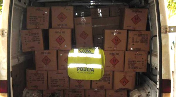 La mercadería secuestrada consiste en 122 cajas de fuegos artificiales conteniendo, varitas mágicas, cañitas silbadoras, perlas, verde esmeralda, tiros surtidos, napoleón, merlín, mosaicos, cielo argentino, estallos, cerecita explosiva, trueno, súper triángulos, fogueta, 3 tiros en caja, morteritos thunder king, base misil, candela, giratorios 6 chisperos, bichitos de luz, silver 48 tiros y súper batería 400 tiros, sin habilitación para el traslado de los mismos de acuerdo a lo que dicta la ley.