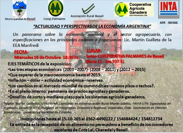 EN BASAIL – Invitan a la charla sobre «actualidad y perspectivas de la economía argentina», con especificaciones en las principales cadenas agropecuarias a cargo del Lic. Martín Guilleta de la EFA Manfredi para este miércoles 19 de octubre a las 18.30 horas.