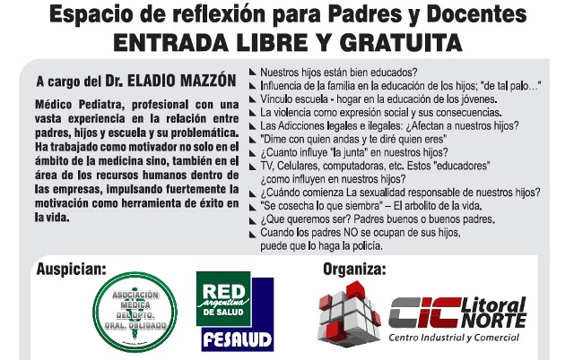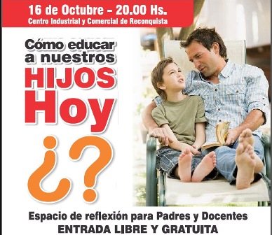 Espacio de reflexión para padres y docentes adminypunto hace 12 años CENTRO INDUSTRIAL Y COMERCIAL DE RECONQUISTA – Con entrada libre, invitan a una charla de reflexión para padres y docentes «como educar a nuestros hijos hoy», a realizarse en el centro industrial y comercial de Reconquista el próximo 16 de octubre.