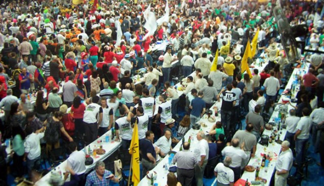 Afuera, la lluvia torrencial. Adentro, una verdadera fiesta de baile, cantos y banderas flameando.