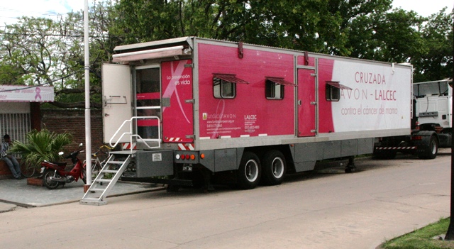 LALCEC VILLA OCAMPO – Nuevamente está en nuestra ciudad, en esta oportunidad dos semanas consecutivas, el mamógrafo móvil de LALCEC-Avon, realizando mamografías a mujeres de entre 40 y 65 años, de escasos recursos y sin cobertura social.La técnica radióloga Silvia Fayo explicó que “el servicio que brindamos es el de 180 mamografías gratuitas por semana, y en Villa Ocampo estamos dos semanas, atendiendo a 45 pacientes por día (de lunes a jueves), mujeres de 40 a 65 años que es la edad con mayor riesgo de padecer cáncer de mamas; entonces, los insumos que tenemos lo dedicamos a ese rango de edad de mayor riesgo. La campaña no significa simplemente realizar la mamografía, entregarla y desentenderse; justamente este móvil visita lugares donde hay una red LALCEC que se ocupe de la devolución del estudio y del control de que se realice lo que deba realizarse a partir del informe de esa mamografía que se entrega”.