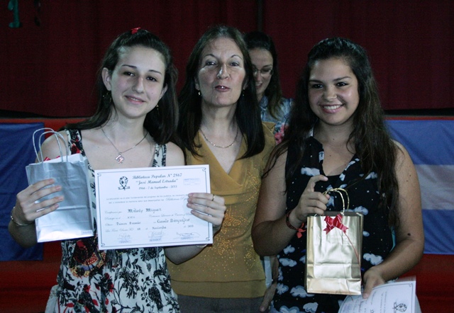 Seguidamente, se entregaron los premios del concurso literario, en el rubro cuentos del nivel secundario, el primer premio fue para Agustina Macuglia con su cuentro «Don Toto y el almacén» e Ignacio Richter con su cuento «La flor de fuego».