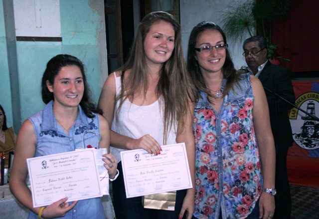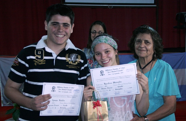 Seguidamente, se entregaron los premios del concurso literario, en el rubro cuentos del nivel secundario, el primer premio fue para Agustina Macuglia con su cuentro «Don Toto y el almacén» e Ignacio Richter con su cuento «La flor de fuego».