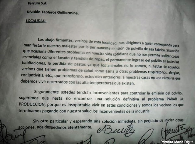 VILLA GUILLERMINA – Graves problemas de convivencia produce el polvillo de la planta industrial Ferrum a vecinos de Villa Guillermina que viven en cercanías del área industrial, lo que llevó a elaborar una nota con firmas dirigida al Presidente de Comuna, Roque Chavez y otra al directorio de la empresa.La misiva solicita la inmediata respuesta al problema que esto acarrea a los vecinos desde hace varios días, y también a sus ganados de especies menores que pastean en el lugar y que hoy no lo hacen porque el polvillo cubrió el lugar.