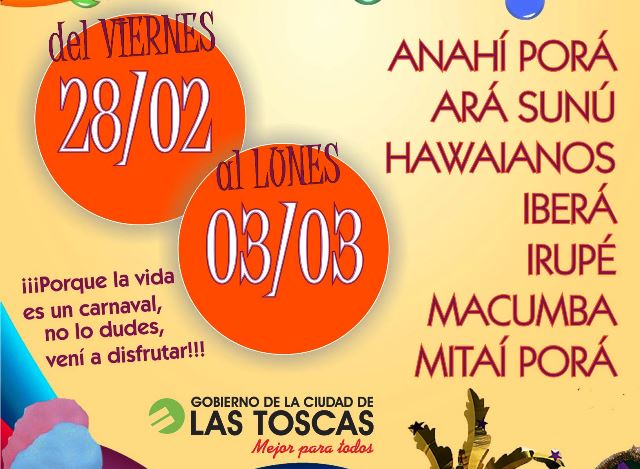 LAS TOSCAS – Arte, destreza, danza, música y mística harán de cuatro noches consecutivas de carnavales en Las Toscas una fiesta de disfrute para todos aquellos que participan, directa o indirectamente, de este espíritu carnavalesco.En este 2014 el “Rey Momo” se hará presente en la ciudad a poco de despedirse el verano y antes de Cuaresma, con espectáculos durante las noches del viernes 28 de febrero, sábado 1, domingo 2 y lunes 3 de marzo.