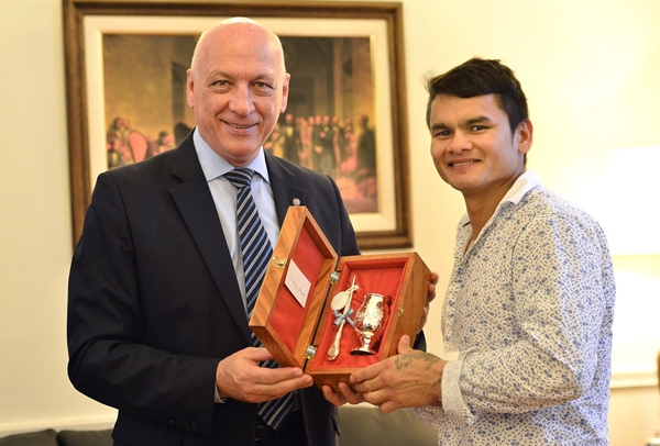 El púgil, oriundo de Margarita (departamento Vera), recibió el saludo del mandatario santafesino, quien le deseó mucha suerte para su próxima presentación.