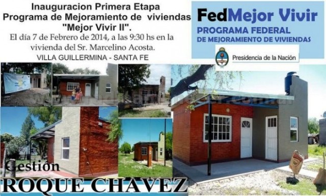 VILLA GUILLERMINA – La inauguración será este viernes 7 de marzo de 2014 y corresponden a la primera etapa en el marco del Programa Mejoramiento de la Vivienda, “Mejor Vivir II”, del Ministerio de Planificación Federal de la Nación.Este viernes 7 de marzo, a las 9:30, en Villa Guillermina, quedarán inauguradas las primeras 8 unidades habitacionales de un total de 50 que contempla el plan.