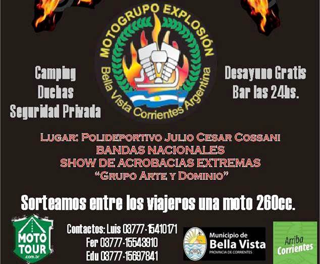 BELLA VISTA – CORRIENTES – este fin de semana –del 7 al 9 de marzo- la localidad de Bella Vista vivirá la VIIIº edición del Moto Encuentro Internacional. Las actividades centrales tendrán como escenario al polideportivo municipal “Julio César Cossani”, esperando superar la marca lograda en la anterior edición del año 2012 cuando 2.200 “motoviajeros” se dieron cita.Días atrás mediante una conferencia de prensa se dio a conocer las alternativas que se vivirán durante este fin de semana en la “tierra de la naranja”. Precisamente, el intendente de Bella Vista, Walter Chávez, calificó al Moto Encuentro como un evento convocante a nivel regional e internacional, y que los organizadores se han preparado para brindarles diferentes actividades, destacándose espectáculos musicales.
