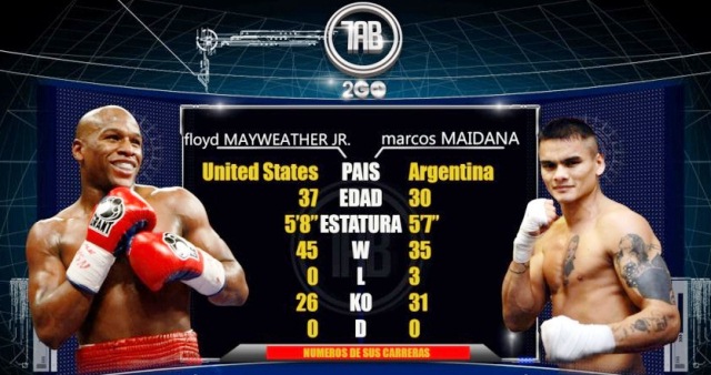 INTERNACIONALES – BOXEO – La pelea del año la sostendrán el próximo 3 de mayo en Las Vegas el favorito Floyd Mayweather Jr. ante el púgil de Margarita, Marcos René Maidana. Combate en el que se unificarán las coronas.El favorito Floyd Mayweather Jr., cuenta con 45 peleas ganadas, 26 por nocaut, sin derrotas, siendo actualmente el campeón Welter del Consejo Mundial de Boxeo (CMB).