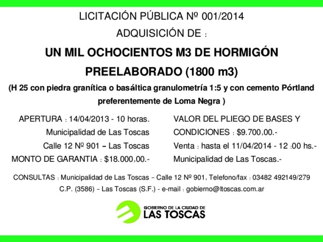 LAS TOSCAS – El Gobierno de la Ciudad Las Toscas invita a presentar ofertas para la adquisición de 1.800 metros cúbicos de hormigón pre-elaborado (LICITACIÓN 001/2014) y 840 barras de hierro de diferente diámetro (LICITACIÓN 002/2014) para la obra que comenzará a fines de abril sobre la arteria de calle N° 2 entre calles 13 y 37 denominada «Calle Colectora – 1º etapa».Dichas ofertas corresponden a dos licitaciones diferentes, con lo cual los interesados deberán adquirir los pliegos correspondientes en el municipio local.