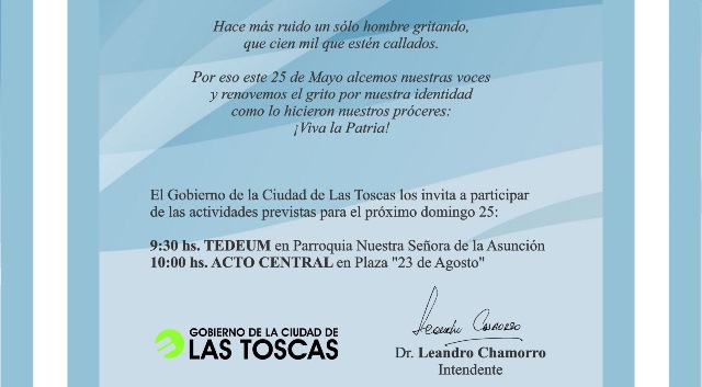 LAS TOSCAS – El gobierno de la ciudad de Las Toscas invita a la comunidad a participar de las actividades programadas para este domingo 25 de mayo en la Plaza 23 de Agosto. Dentro de los festejos por el Día de la Patria, el 25 de mayo a partir de las 15 hs. la Dirección de Cultura y Educación coordinará la tradicional feria de emprendedores y exposición de platos típicos, en articulación con Oficina de Empleo y la Dirección de Producción.