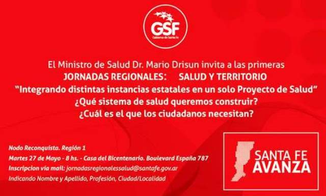 Bajo el lema “Salud y Territorio. Integrando distintas instancias estatales en un solo Proyecto de Salud”, este martes 27 de mayo se llevará a cabo en la Casa del Bicentenario de la ciudad de Reconquista, las Jornadas Regionales de Salud, con el objetivo de fundar espacios de reflexión y discusión en el territorio sobre el sistema de salud provincial que se está llevando adelante.