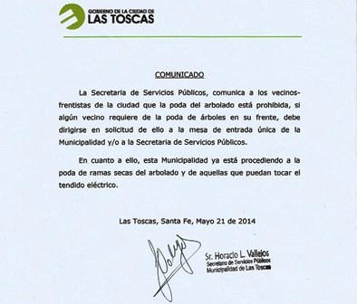 LAS TOSCAS – La Secretaría de Servicios Públicos, a cargo de Horacio Vallejos, comunica a los vecinos frentistas de la ciudd que la poda del arbolado esta prohibida.