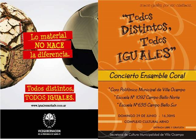 VILLA OCAMPO – La Secretaría de Cultura de la Municipalidad de Villa Ocampo invitan a la presentación del Programa “Todos Distintos, Todos Iguales”, bajo el lema: “Somos iguales, por eso cantamos”, impulsado desde la Vicegobernación de la Provincia de Santa Fe, donde participaran el Coro Polifónico Municipal, y las escuelas 1092 de Campo Bello Norte y 6315 de Campo Bello Sur.El evento se llevará a cabo el domingo 29 de junio, a partir de las 16:30 Hs. en la sala del Complejo “Arno”.