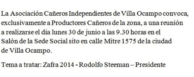 Comunicado de la Asociación Cañeros adminypunto hace 11 años VILLA OCAMPO – Parte de prensa de la Asociación Cañeros Independientes de Villa Ocampo, convocando a una reunión para este lunes 30 de junio.