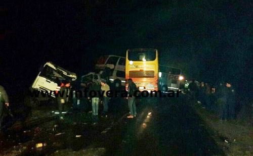 En el km 719, sobre la localidad de Vera, colisionaron tres camiones, un colectivo de la Empresa El Práctico y otro del Cruzero del Norte y dos autos. Trabajan en el lugar, Bomberos Zapadores de Vera y Malabrigo, Policía Criminalista de Reconquista y Vera.