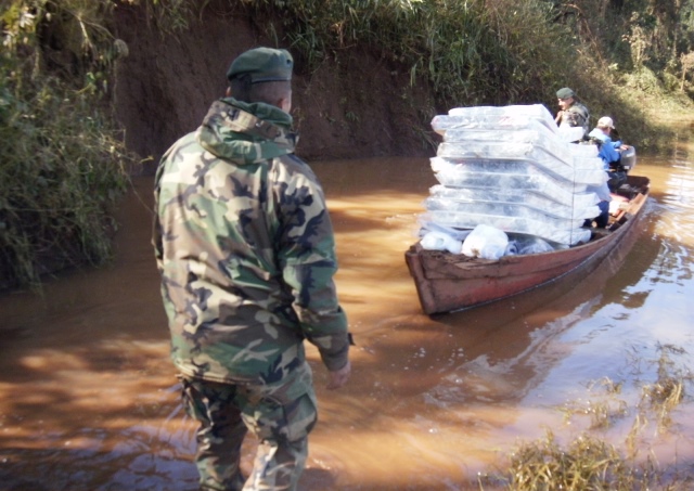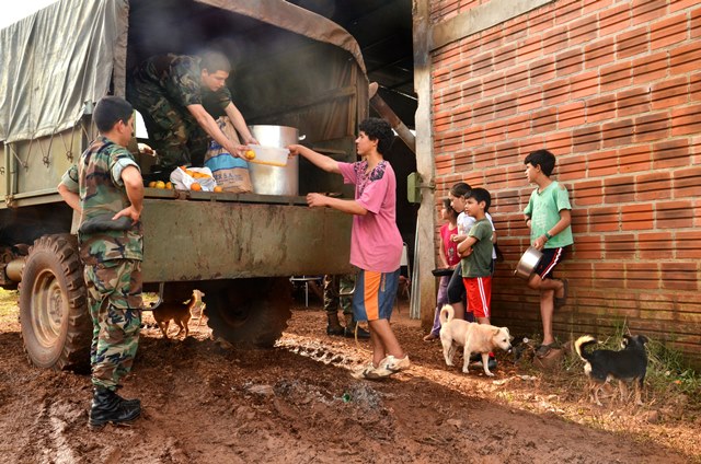 En El Soberbio, Misiones, las Compañías de Cazadores 18 y de Comunicaciones 12 prestan colaboración en la distribución de comida y traslado de evacuados.