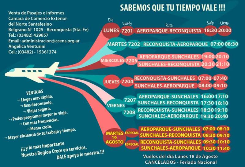 Más vuelos Rqta – Bs.As. adminypunto hace 11 años RECONQUISTA – CAMARA DE COMERCIO EXTERIOR – La Cámara de Comercio Exterior del Norte Santafesino, ofrece un servicio aéreo super mejorado en cuanto a frecuencias y servicios, luego de un importante esfuerzo publico-privado para lograr esta mejora.