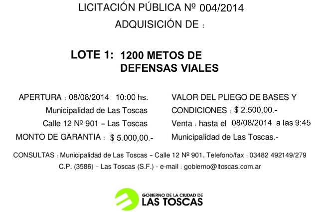 LAS TOSCAS – La municipalidad de Las Toscas llama a licitación para la compra de defensas viales y piedras, para ser utilizadas en las obras de calle colectora y estabilizado granular de los barrios Asunta y Virgen Niña respectivamente,; y según los correspondientes pliegos de bases y condiciones que deberán ser adquiridos en la sede municipal. Licitación 004/2014: para la compra de 1200 metros de defensas viales de acero galvanizado y accesorios, destinados a la obra de calle colectora y con el fin de delimitar la Ruta nacional 11 de la calle 2.