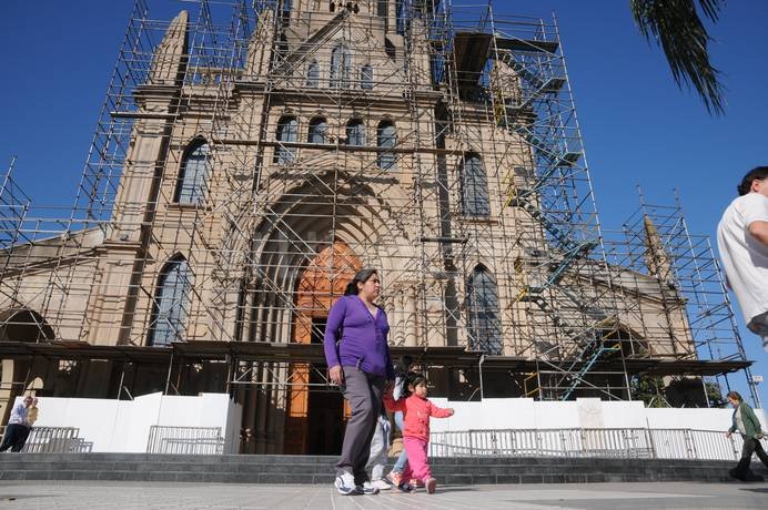 GUADALUPE NORTE – Una estructura metálica recubre la fachada de la Basílica Ntra. Señora de Guadalupe, en la capital provincial: es el imponente andamio de 50 metros de altura donde trabajan los ocho restauradores de su fachada principal y cúpula. La estructura de caños, una especie de edificio traslúcido, dista de ser sólo un detalle. Su montaje fue el único modo de acceder a la cúpula y a la cruz, y su alquiler abarca buena parte del costo de la restauración.