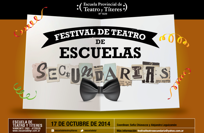 EL 17 DE OCTUBRE EN ROSARIO – La Escuela Provincial de Teatro y Títeres N° 5029, dependiente del Ministerio de Innovación y Cultura, convoca a todas las escuelas de enseñanza media que tengan Teatro como espacio curricular o extracurricular a participar del Sexto Festival de Teatro de Escuelas Secundarias.El Festival se propone generar un espacio de encuentro para el intercambio de producciones e inquietudes, promover la actividad teatral entre los adolescentes y dar a conocer las actividades y trayectos formativos de nuestra Escuela.