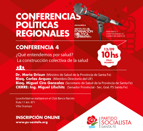 VILLA OCAMPO – PARTIDO SOCIALISTA – La Municipalidad de Villa Ocampo invita a presenciar la Conferencia “¿Qué entendemos por salud?. La construcción colectiva”, que organiza el Partido Socialista de nuestra ciudad, el sábado 13 de setiembre, a partir de las 10:00 Hs. en el Club Banco Nación.Serán panelistas:
