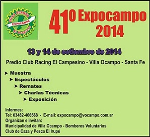 VILLA OCAMPO – El intendente Enrique Paduán invita a la comunidad a presenciar el acto inaugural de la Expocampo 2014, que se va a llevar a cabo este sábado 13 de setiembre, a las 21:00 Hs. en el Polideportivo de Racing “El Campesino”.Entre las autoridades invitadas, confirmó su presencia el senador provincial Miguel Lifschitz; y el intendente de Bella Vista, Walter Chávez, acompañado por una comitiva de la vecina ciudad correntina.