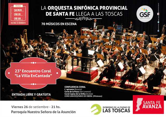 LAS TOSCAS – El Gobierno de la Ciudad de Las Toscas invita a participar de un concierto a cargo de la Orquesta SinfónicaProvincial de Santa Fe que tendrá lugar en la Parroquia Nuestra Señora de la Asunción (calle 19 entre 8 y 10), este viernes 26 de septiembre a las 21 hs., con entrada libre y gratuita.