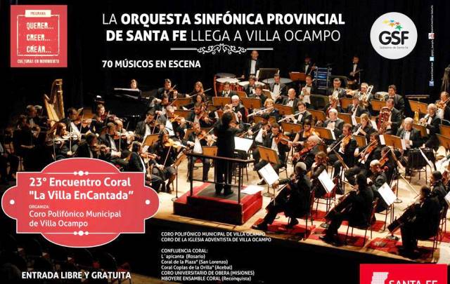 EN VILLA OCAMPO – La Secretaría de Cultura de la Municipalidad de Villa Ocampo invita a todo el público interesado en presenciar un “concierto didáctico”, en horas de la mañana y su actuación por la noche, que brindará la Orquesta Sinfónica de la Provincia de Santa Fe, con acceso libre y gratuito.