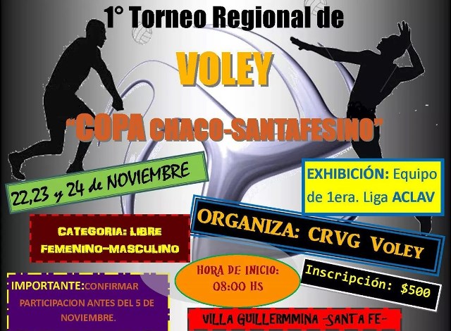 EN VILLA GUILLERMINA – Este fin de semana se llevara a cabo un torneo de voley «Copa Chaco-Santafesino» en Villa Guillermina, que sera interprovincial, ya que participaran equipos de las provincias de Santa Fe, Chaco y Corrientes.