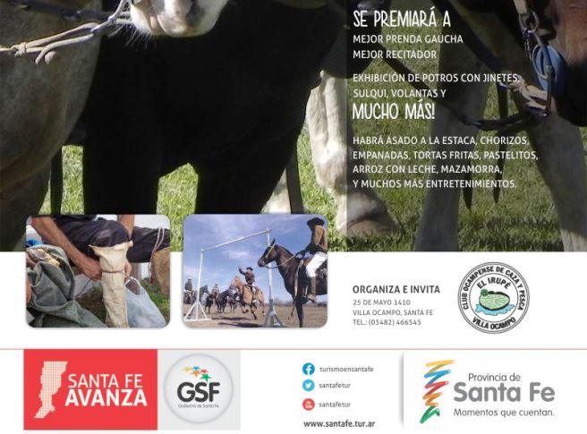EN EL CLUB DE CAZA Y PESCA «EL IRUPÉ» – Este 23 de noviembre en el camping «Don Avelino» del club de caza y pesca «El Irupé», se llevará a cabo la 1ª Fiesta de la tradición gaucha con un programa de eventos, show musicales y premios.