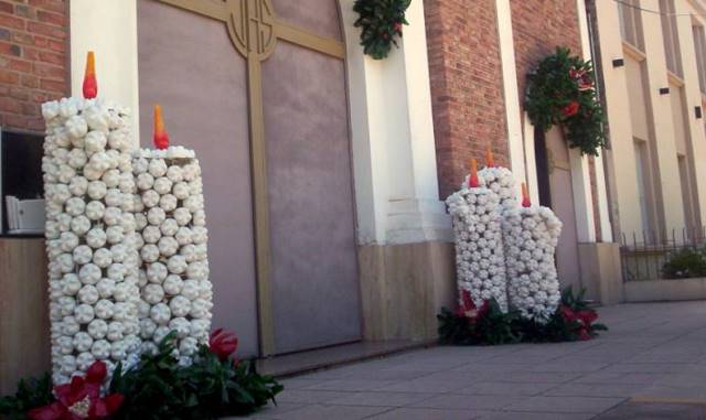 VILLA OCAMPO – TEMPLO PARROQUIAL – Un grupo de mujeres se propusieron este año adornar la fachada del Templo Parroquial con motivos navideños gigantes elaborados artesanalmente, utilizando una gran cantidad de botellas plásticas recicladas.