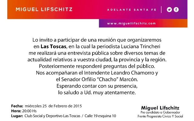 LAS TOSCAS – Recibimos la invitación del Precandidato a Gobernador Ing. Miguel Lifschitz y Precandidato a Vicegobernador CPN Carlos Fascendini a la conferencia de prensa para medios de comunicación (19:30 hs.) y entrevista pública (20:00 hs.) en el Club Social Las Toscas, este miércoles 25 de febrero de 2015.