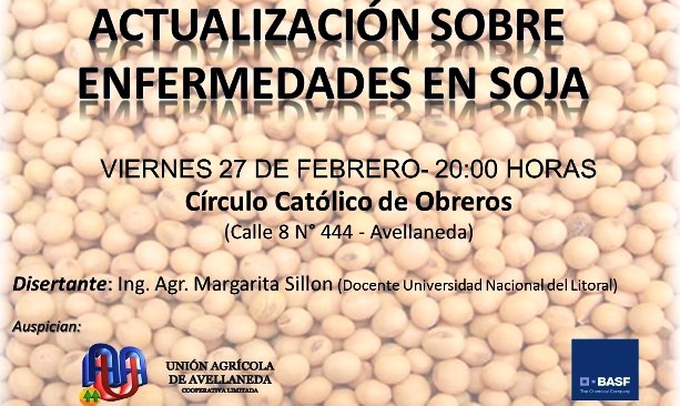 UNIÓN AGRÍCOLA DE AVELLANEDA – Invitan a participar de una charla sobre «Actualización sobre enfermedades en soja». La misma será el día viernes 27 de febrero, a las 20:00 horas en el Círculo Católico de Obreros de Avellaneda. Desde la Oficina de Desarrollo Agropecuario de la Unión Agrícola de Avellaneda Coop. Ltda., invitamos a participar de una charla sobre «Actualización sobre enfermedades en soja».