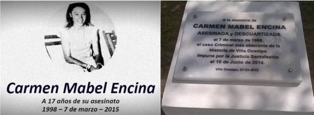 “A la memoria de CARMEN MABEL ENCINA ASESINADA Y DESCUARTIZADA el 7 de marzo de 1998, el caso criminal más aberrante de la historia de Villa Ocampo Impune por la Justicia Santafesina. El 10 de junio de 2014.»